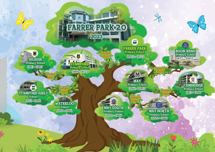 Just as the lyrics found in the school song described, the school is like a plant that has grown to become a big strong tree. This tree is supported by the deep roots of the 9 schools which contributed to her history over 7 decades as depicted in the mural below.