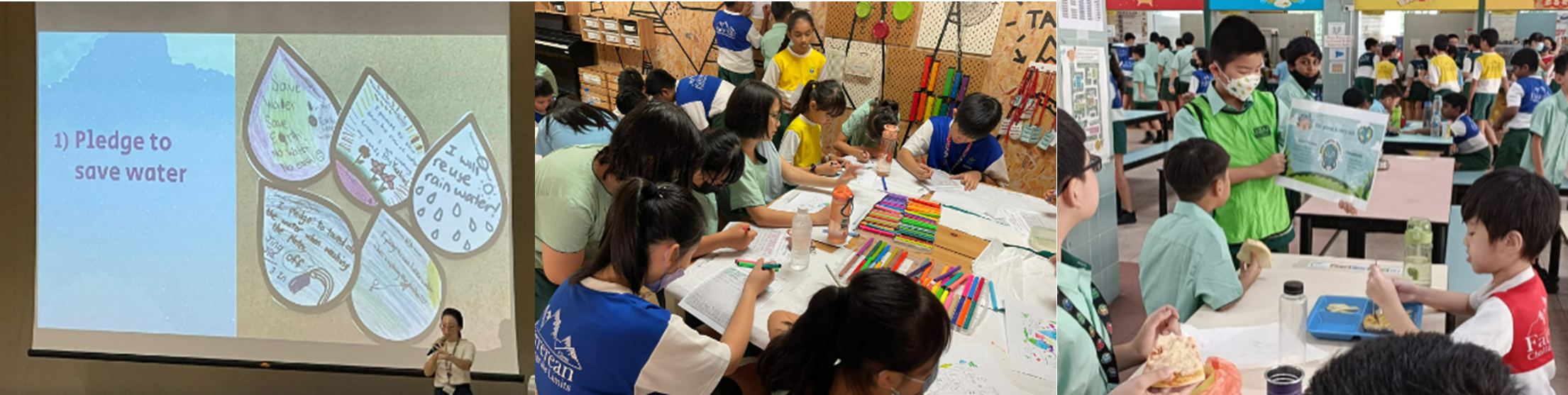 We kicked off the commemoration with an assembly programme presented by our students and teacher. Staff and students alike shared practices that they adopt to save water. The objectives of the school-wide activities were to help students recognize that water is a precious resource and that it is important to take proactive steps to tackle the global water crisis for water sustainability. This aligns with the Energy Reset pillar of the Singapore Green Plan 2030.